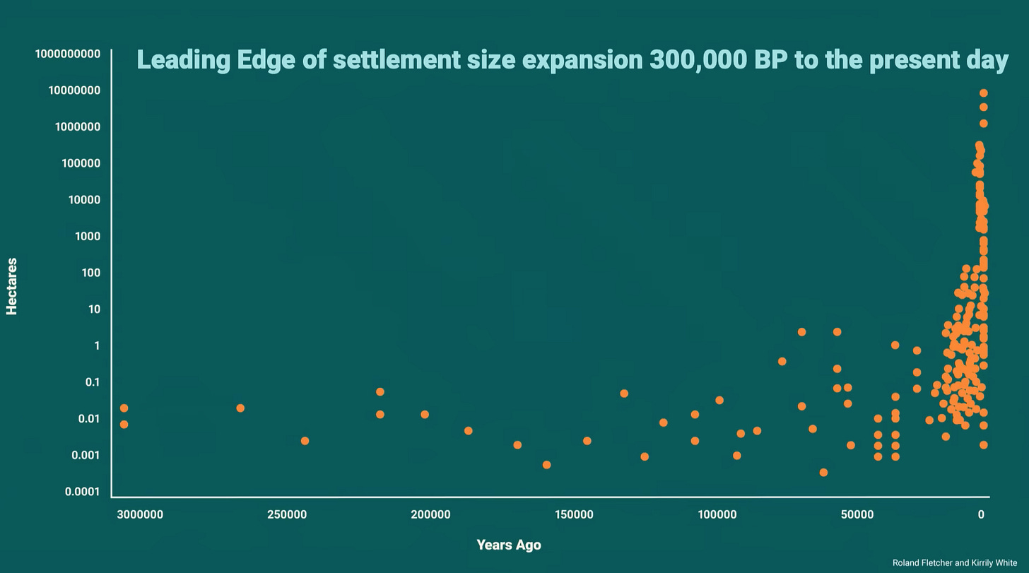 Every single object, argues Kauffman, has multiple potential uses, each of which might transform the way we live if used or combined with another object in the right way. Crucially, this spectrum of possible uses increases exponentially, not linearly. This means that technological progress is more likely to follow a hockey stick curve of growth, much like the one seen in the growth of new species during the Cambrian explosion. In fact, we are likely already well into an accelerated stage of growth in innovation; Kauffman notes that the size and frequency of human settlements today already surpass what would be expected if historical settlements expanded linearly (shown below). And if that doesn’t persuade you, think of the scale of technological change between 1990 and today versus that between 1890 and 1924.
